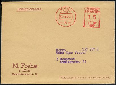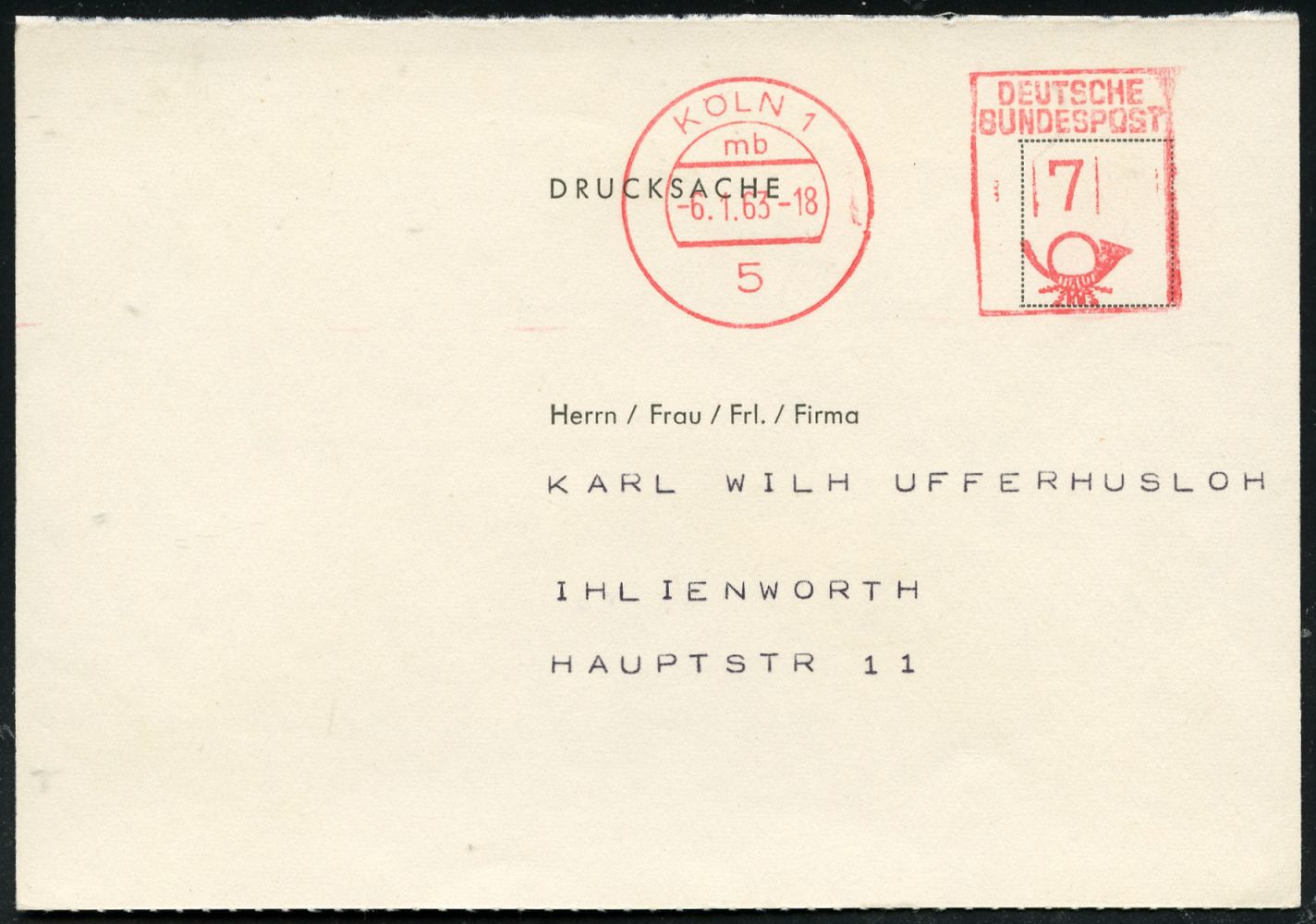 9097 | 8 € | 5000 KÖLN (Post-Freistempel) : 5 KÖLN 1/ mk/ DEUTSCHE/ BUNDESPOST 1963 (27.9.) PFS "Hochrechteck" Posthorn mit neuer PLZ u. Uhrzeit, UB "mk", 15 Pf. = Briefdrucksache , Firmen-Bf.: M. Frehe.. (Dü.D-17) | ![]() | |