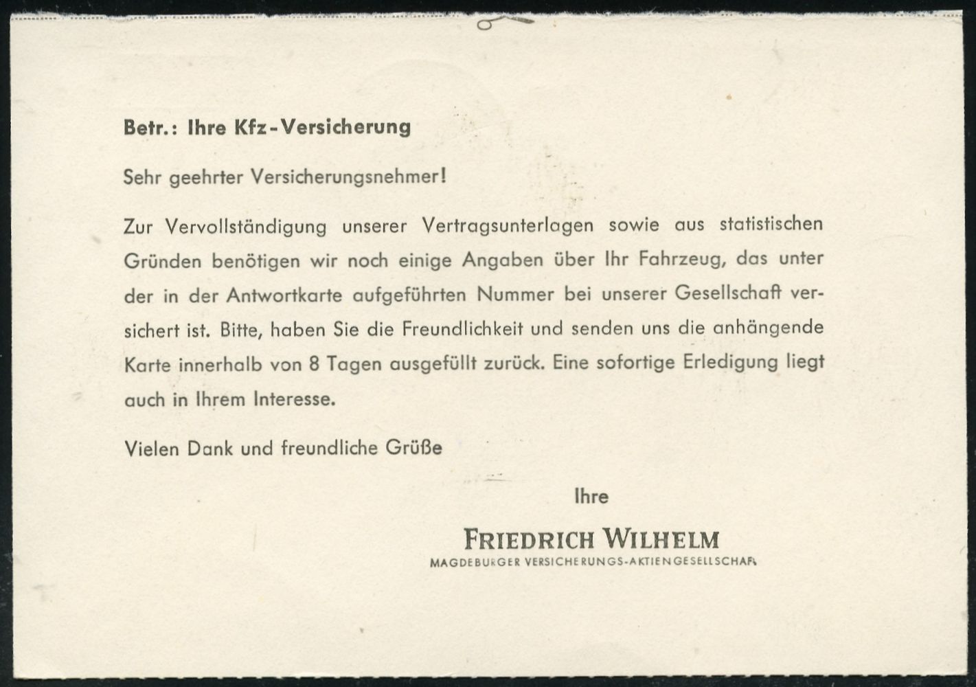 9098 | 6 € | 5000 KÖLN (Post-Freistempel) : 5 KÖLN 1/ mb/ DEUTSCHE/ BUNDESPOST 1963 (6.1.) PFS "Hochrechteck" Posthorn mit neuer PLZ u. Uhrzeit, UB "mb" , (halbe) Firmen-Kt.: MAGDEBURGER VERSICHERUNGS-AG (Kfz.-Vers.) n. Ihlienworth (Dü.D-17) | ![]() ![]() | |