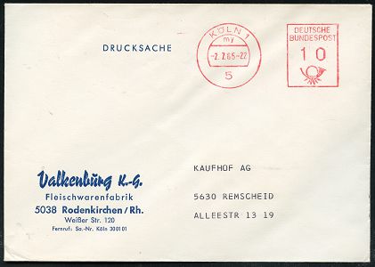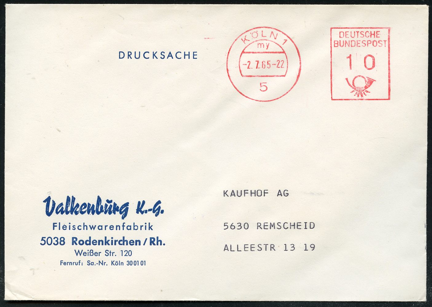 9102 | 5 € | 5000 KÖLN (Post-Freistempel) : 5 KÖLN 1/ my/ DEUTSCHE/ BUNDESPOST 1965 (2.7.) PFS "Hochrechteck" Posthorn mit PLZ u. Uhrzeit, UB "my" , Firmen-Bf.: Valkenburg K.G., Fleischwarenfabrik, 5038 Rodenkirchen/Rh. (Dü.D-17) | ![]() | |