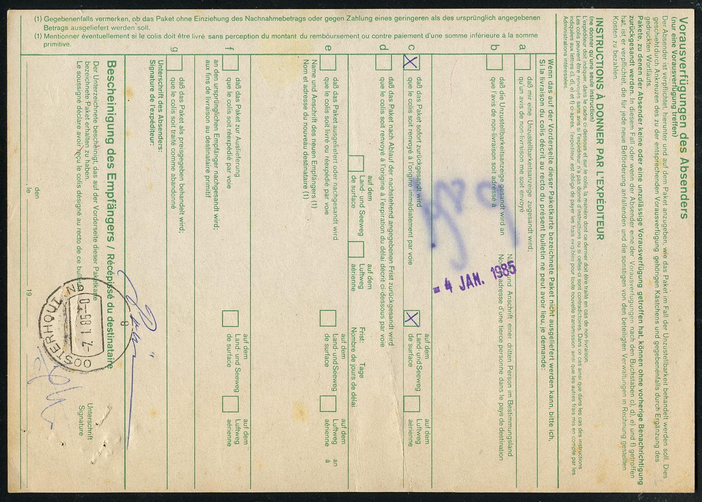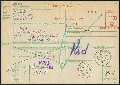 9104 | 18 € | 5000 KÖLN (Post-Freistempel) : = mb = KÖN 18/ DEUTSCHE/ BUNDESPOST 1984 (21.12.) Paket-PFS mit neuem, stilis. Posthorn ohne PLZ, 1130 Pf. + brauner Paketzettel: 5000 Köln 18 + schw. 1K-Segment: 5 KÖLN 18/e + Transit-Stpl. 4240 EMMERICH 2/e, Ausl.-Paketkarte (div. Beförd.-Spuren) n. Holland, rs. AS., seltene Portostufe! (Dü.H-6 C) | ![]() ![]() | |