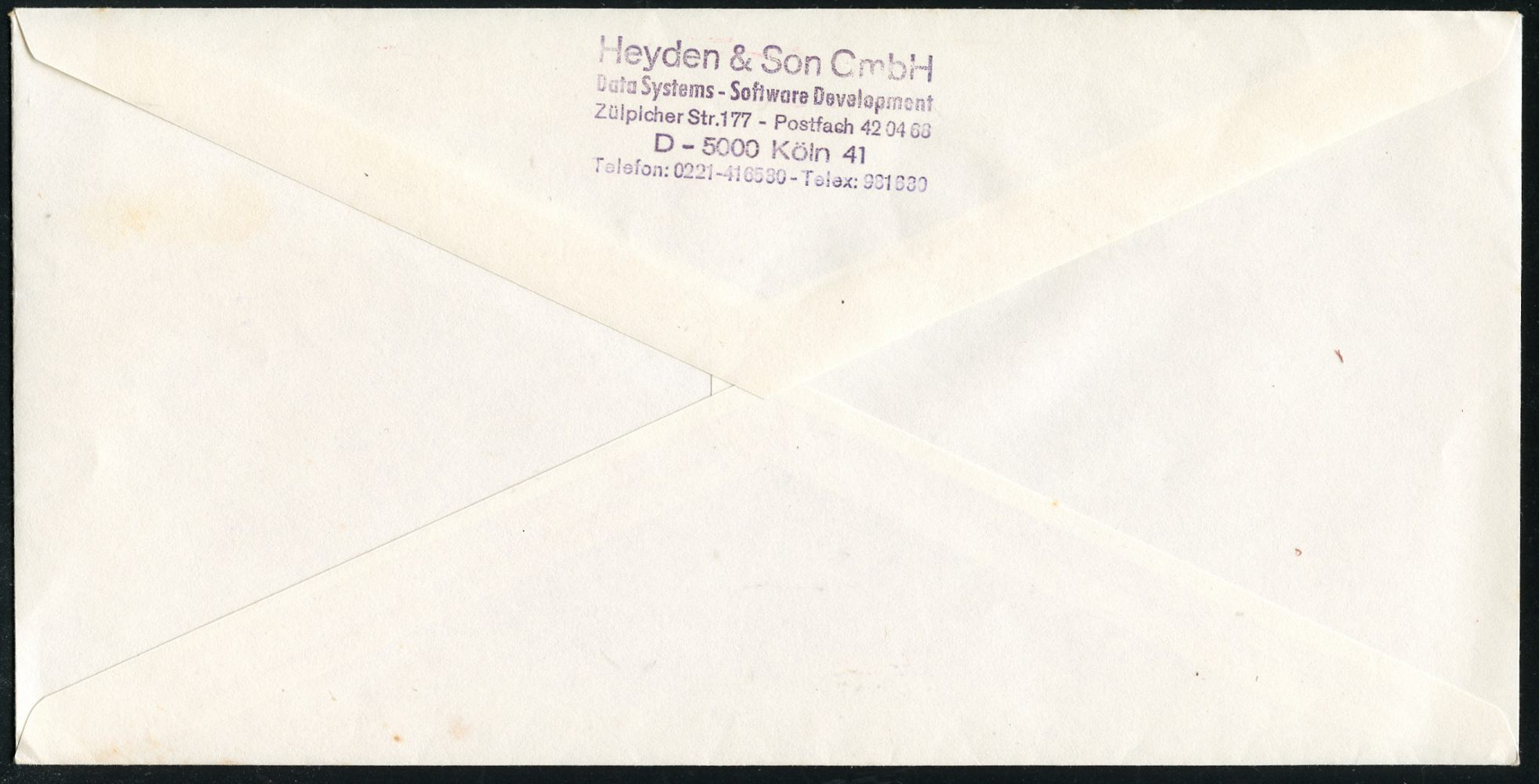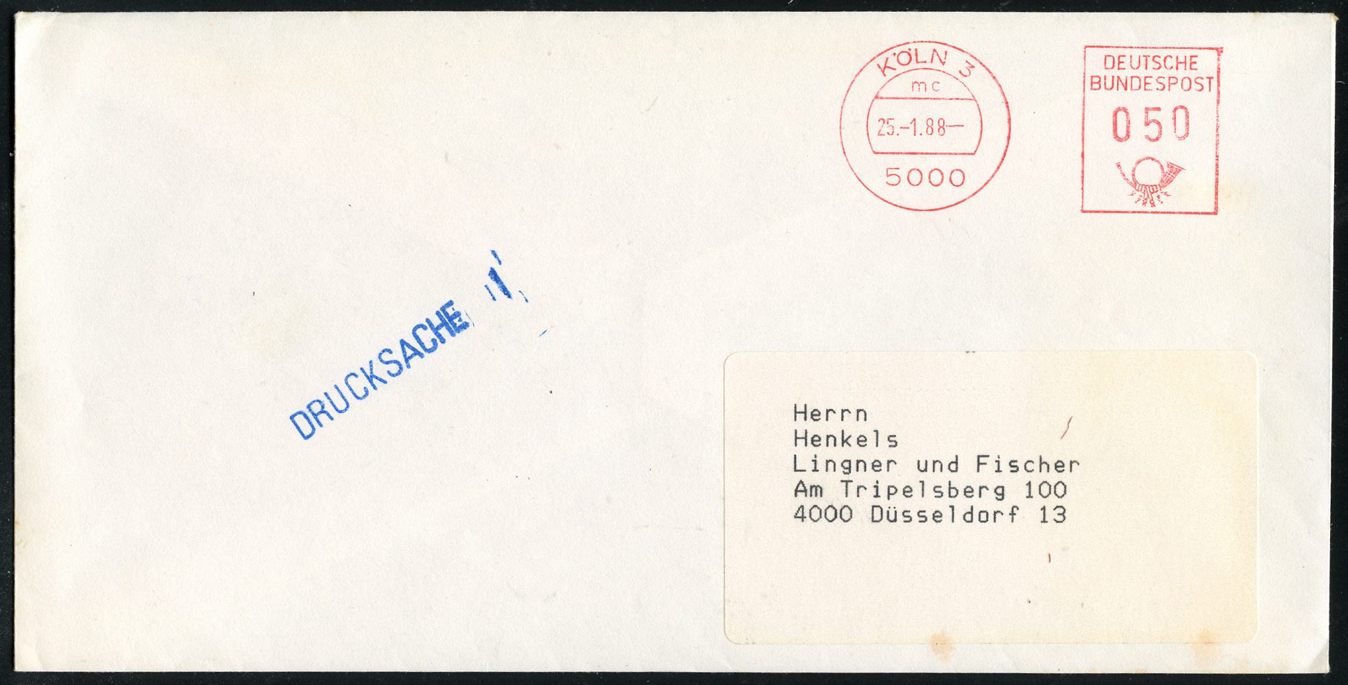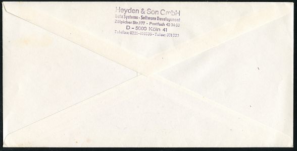 9105 | 6 € | 5000 KÖLN (Post-Freistempel) : 5000 KÖLN 2/ mc/ DEUTSCHE/ BUNDESPOST 1988 (25.1.) PFS "Hochrechteck", altes Posthorn mit PLZ vierstellig ohne Uhrzeit, UB "mc", 050 Pf. , rs. Abs.-5L: Heyden & Son GmbH/Data-Systems - Software.., Inl.-Drs.-Bf. (Dü.D-17) | ![]() ![]() | |