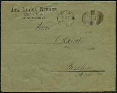 9021 | 18 € | 5000 KÖLN (Post-Freistempel) : KÖLN/ * 1 I 1921 (30.3.) schwarzer Infla-PFS 10 Pf. "Ziermuster" auf Firmen-Bf.: Jos. Ludw, Breuer.. (kl. Klappenfehler rs.) n. Parchim (Dü.D-1, Nr.1) | ![]() | |