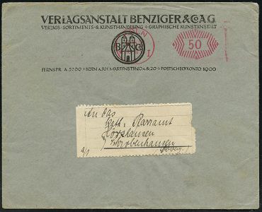 9026 | 18 € | 5000 KÖLN (Post-Freistempel) : KÖLN/ * 1 I 1922 (13.5.) roter Ziermuster.PFS 50 Pf. auf Firmen-Bf.: VERLAGSANSTALT BENZINGER & Co AG.. (Firmen-Logo) (Dü.D-1, Nr.11) | ![]() | |