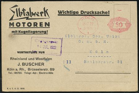 9028 | 14 € | 5000 KÖLN (Post-Freistempel) : KÖLN/ * 1 I 1922 (13.7.) roter Ziermuster.PFS 50 Pf. auf (halber) auf Infla-Reklame-Kt.: Elbtalwerk MOTOREN.. (1 Reg.-Loch geschl.) mit Preisen von Drehstrom-Motoren, Orts-Kt. (Dü.D-1, Nr.11) | ![]() | |
