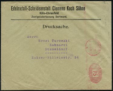 9029 | 25 € | 5000 KÖLN (Post-Freistempel) : KÖLN/ * 1 I 1922 (26.7.) roter Ziermuster-PFS 75 Pf. auf Firmen-Bf.: Edelmetall-Scheideanstalt Clemens Koch Söhne.. n. Düsseldorf, seltene Portostufe! (Dü.D-1, Nr.13) | ![]() | |