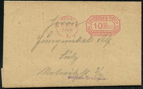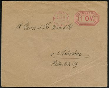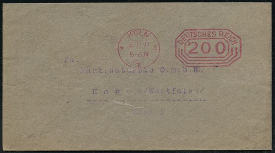 9032 | 14 € | 5000 KÖLN (Post-Freistempel) : KÖLN/ * 1 II/ DEUTSCHES REICH 1923 (28.2.) Infla-PFS "Achteck" 10 M (ark) , rs. Abs.-2L: G. E. KUHNEN/ Köln-Deutz (= Papierfabrik) n. München (Dü.D-3, Nr.39) | ![]() | |