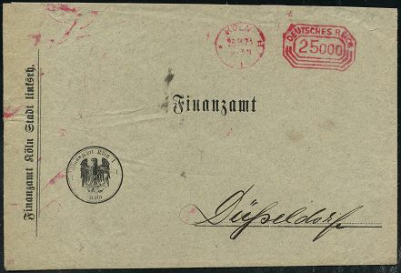 9038 | 25 € | 5000 KÖLN (Post-Freistempel) : KÖLN/ *1II/ DEUTSCHES REICH 1923 (28.8.) Infla-PFS "Achteck" 25ooo (Mark) auf Dienst-Bf.: Finanzamt Köln Stadt linksrh. (oben u. rs. Riß geschl.) n. Düsseldorf, seltene Portostufe! (Dü.3, Nr.92) | ![]() | |