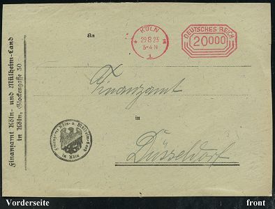 9039 | 15 € | 5000 KÖLN (Post-Freistempel) : KÖLN/ *1II/ DEUTSCHES REICH 1923 (29.8.) Infla-PFS "Achteck" 20ooo (Mark) auf Dienst-Vorderseite: Finanzamt Köln u.Mülheim-Land.. (Dü.D-3, Nr.90) | ![]() | |