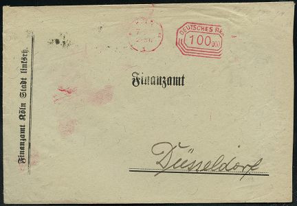 9040 | 15 € | 5000 KÖLN (Post-Freistempel) : KÖLN/ *1II/ DEUTSCHES REICH 1923 (7.9.) Infla-PFS "Achteck" 100ooo (Mark) (rechts gering nicht voll) auf Dienst-Bf.: Finanzamt Köln Stadt linksrh. n. Düsseldorf (Dü.D-3, Nr.107) | ![]() | |