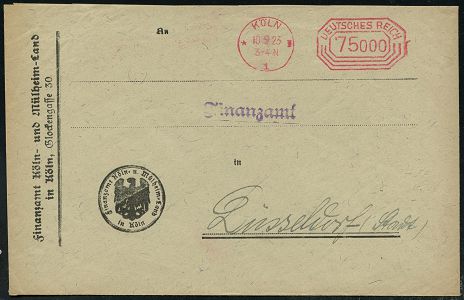 9041 | 18 € | 5000 KÖLN (Post-Freistempel) : KÖLN/ *1II/ DEUTSCHES REICH 1923 (10.9.) Infla-PFS "Achteck" 75ooo (Mark) auf Dienst-Bf.: Finanzamt Köln u. Mülheim-Land.. n. Düsseldorf (Dü.D-3, Nr.105) | ![]() | |