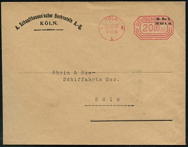 9047 | 18 € | 5000 KÖLN (Post-Freistempel) : KÖLN/ *1II/ DEUTSCHES REICH 1923 (25.10.) Infla-PFS 200ooo (Mark) auf Firmen-Bf.: A. Schaaffhausen´scher Bankverein A.G., Orts-Bf., vergl. Kat.-Nr. 9106 (Dü.D-3, Nr.125) | ![]() | |