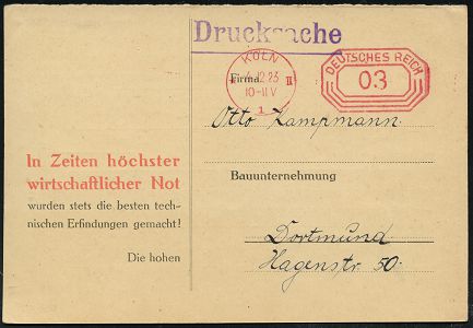 9051 | 35 € | 5000 KÖLN (Post-Freistempel) : KÖLN/ *1II/ DEUTSCHES REICH 1923 (4.12.) PFS "Achteck" 03 Pf. = Währungsreform im Dezember = 1 Milliarde = 1 Pf. auf (halber) Reklame-Kt. "In Zeiten höchster wirtschaftlicher Not.." über Patent-Aufzugsanlage "Hexe-Modell 1923" D.R.P., seltener Dezember-Beleg (Dü.D-4 = Dezember-Beleg!) | ![]() ![]() | |