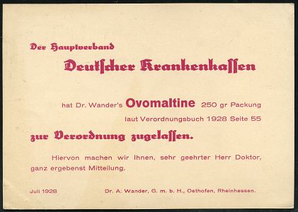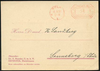 9055 | 12 € | 5000 KÖLN (Post-Freistempel) : KÖLN/ *1c/ DEUTSCHES REICH 1928 (13.8.) PFS "Achteck" 3 Pf. mit UB "c" auf Reklame-Kt. Dr. A. Wander GmbH, Osthofen, Rheinhessen über Ovomaltine (Dü.D-4) | ![]() ![]() ![]() | |
