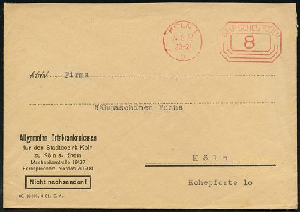 9058 | 5 € | 5000 KÖLN (Post-Freistempel) : KÖLN 1/ g/ DEUTSCHES REICH 1932 (24.3.) PFS "Achteck" 8 Pf. mit UB "g" , Firmen-Orts-Bf.: Allgem. Ortskrankenkasse.. (Dü.D-4) | ![]() ![]() | |