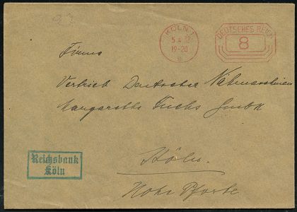 9059 | 10 € | 5000 KÖLN (Post-Freistempel) : KÖLN 1/ g/ DEUTSCHES REICH 1932 (5.4.) PFS "Achteck" 8 Pf. mit UB "g" + grüner Abs.-Ra.2: Reichsbank/ Köln , Orts-Bf. (Dü.D-4) | ![]() ![]() | |