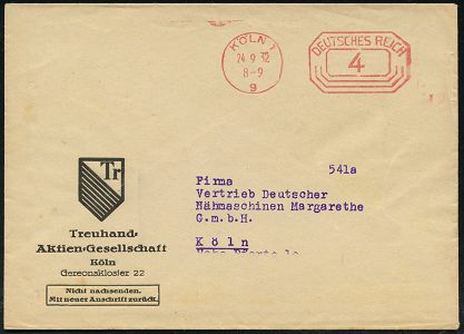 9061 | 6 € | 5000 KÖLN (Post-Freistempel) : KÖLN 1/ g/ DEUTSCHES REICH 1932 (24.9.) PFS "Achteck" 4 Pf. mit UB "g" auf Firmen-Bf.: Treuhand-AG..mit Firmen-Wappen (Dü.D-4) | ![]() ![]() | |