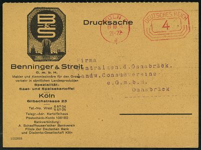 9062 | 8 € | 5000 KÖLN (Post-Freistempel) : KÖLN 1/ d/ DEUTSCHES REICH 1932 (19.10.) PFS "Achteck" 4 Pf. mit UB "d" auf (halber) dekorativer Firmen-Kt.: Benninger & Streit GmbH.. Spezialität Saat- u. Speisekartoffel (Preiliste landwirtschaftl. Produkte) n. Osnabrück (Dü.D-4) | ![]() ![]() ![]() | |