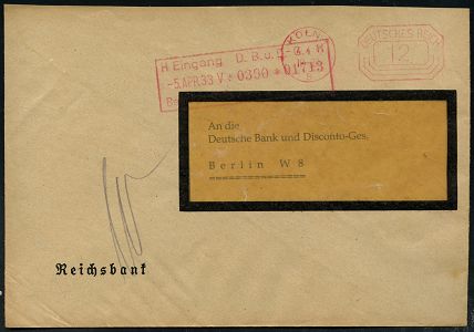 9063 | 12 € | 5000 KÖLN (Post-Freistempel) : KÖLN 1/ B/ DEUTSCHES REICH 1933 (4.4.) PFS "Achteck" 12 Pf. mit UB "B" , Dienst-Bf.: Reichsbank (Dü.D-4 = Briefporto!) | ![]() ![]() | |