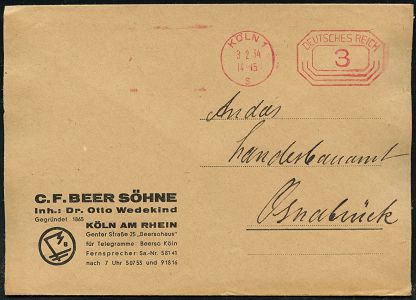 9064 | 6 € | 5000 KÖLN (Post-Freistempel) : KÖLN 1/ S/ DEUTSCHES REICH 1934 (3.2.) PFS "Achteck" 3 Pf. mit UB "S" , Firmen-Bf.: C. F. BEER SÖHNE.. "Beersohaus".. (Dü.D-4) | ![]() ![]() | |