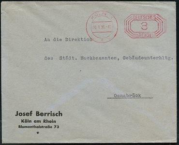 9065 | 6 € | 5000 KÖLN (Post-Freistempel) : KÖLN 1/ s/ DEUTSCHES/ REICH 1935 (30.1.) PFS "Achteck" zweizeilig mir 2Kreis-Ortsstempel , Firmen-Bf.: Josef Berrisch.. (Dü.D-5) | ![]() ![]() | |