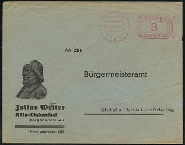 9068 | 16 € | 5000 KÖLN (Post-Freistempel) : KÖLN 1/ h/ DEUTSCHES/ REICH 1937 (8.11.) PFS "Achteck" zweizeilig, 3 Pf. auf Reklame-Bf.: Julius Wetter, Köln-Lindenthal.. mit Seemann u. Seemannshut = Firma für Schutzkleidung! (kl. Kerbe), vergl. Kat.-Nr. 9083 (Dü.D-5) | ![]() ![]() | |