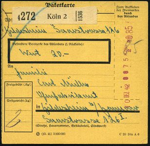 9071 | 20 € | 5000 KÖLN (Post-Freistempel) : Köln/ 2 1942 (10.12.) Anker-Registrierkassen-Paket-FS *0.85 RM + NS-Prägeadler horizontal + schw. Paketzettel: Köln 2, Inl.-Paketkt. n. Hildesheim (Dü.H-1A / 2) | ![]() | |