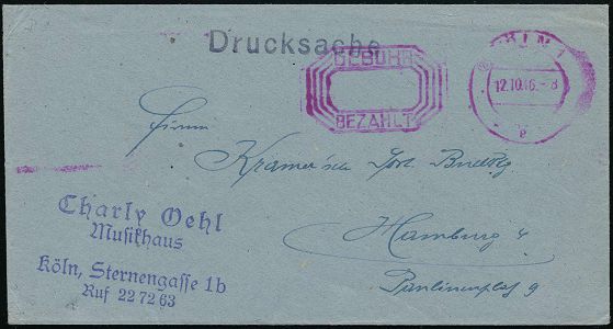 9075 | 18 € | 5000 KÖLN (Post-Freistempel) : (22) KÖLN 1/ e/ GEBÜHR/ BEZAHLT 1946 (12.10.) Maschinen-PFS Sonderform "Achteck" ohne Wertangabe in v i o l e t t , Inl.-Drs.-Bf., Abs.-2L: Charly Oehl/Musikhaus n. Hambg. (Dü.245 (violett), nur in Köln verwendet!) | ![]() | |