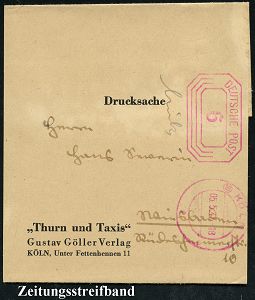 9077 | 14 € | 5000 KÖLN (Post-Freistempel) : (22) KÖLN 1/ e/ DEUTSCHE POST 1947 (5.5.) PFS "Achteck" 6 Pf. Wertrahmen l i n k s auf kleinem Zeitungs-Streifband "Thurn u. Taxis", Gustav Göller Verlag.. (Dü.D-11, Nr.260) | ![]() | |