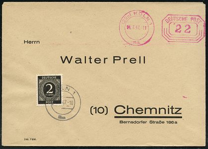 9078 | 18 € | 5000 KÖLN (Post-Freistempel) : (22c) KÖLN 1/ ma/ DEUTSCHE POST 1947 (24.7.) PFS "Achteck" Wertrahmen r e c h t s mit UB "ma". Postleitzahl mit "c", seltene Portostufe 22 Pf. + Nachfrankatur 2 Pf. Kontrollrat Ziffer mit 2K-Steg: (22 c) KÖLN 1, Fern-Bf. (Dü.D-11, Nr.260) | ![]() | |