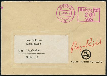 9081 | 14 € | 5000 KÖLN (Post-Freistempel) : KÖLN 1/ mb/ Deutsche Post 1949 (3.12.) violetter PFS Querrechteck "Posthorn" UB "mb" ohne PLZ, 20 Pf. = Briefporto! , zweifarbiger Firmen-Fern-Bf.: Pelz-Riebel, KÖLN.. mit Firmen-Logo (Zobel ?) (Dü.D-14, Nr. 267) | ![]() | |