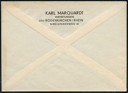 9082 | 8 € | 5000 KÖLN (Post-Freistempel) : KÖLN 1/ mb/ DEUTSCHE POST 1950 (25.4.) violetter PFS Querrechteck "Posthorn" , UB "mb" 4 Pf. auf Firmen-Bf., rs. Abs.-Vordruck: KARL MARQUARDT.. (22 c) RODENKIRCHEN = 5 Köln 50 (Dü.D-15, Nr.269) | ![]() ![]() | |