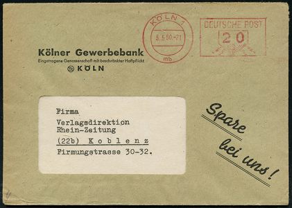9085 | 12 € | 5000 KÖLN (Post-Freistempel) : KÖLN 1/ mb/ DEUTSCHE POST 1950 (5.5.) PFS "Querrechteck" UB "mb" mit Poshorn, 20 Pf. = Briefporto! , Firmen-Reklame-Bf.: Kölner Gewerbebank.. "Spare bei uns!" (Dü.D-15, Nr.269) | ![]() | |