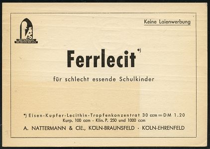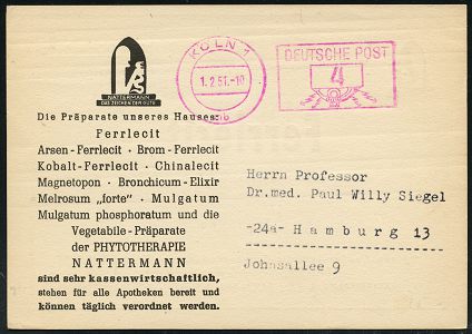 9089 | 15 € | 5000 KÖLN (Post-Freistempel) : KÖLN 1/ mb/ DEUTSCHE POST 1951 (1.2.) violetter PFS Querrechteck, UB "mb" mit Posthorn, 4 Pf. auf Reklame-Kt.: NATTERMANN, Ferrlecit für schlecht essende Schulkinder.. (rs. leichte Bräunung) mit Firmen-Logo = homöopathische Pharma-Fabrik (Dü.D-15, Nr.269) | ![]() ![]() | |
