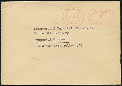 9091 | 6 € | 5000 KÖLN (Post-Freistempel) : (22c) KÖLN 1/ mh/ DEUTSCHE/ BUNDESPOST 1953 (13.6.) PFS "Achteck" mit Posthorn u. Postleitzahl, UB "mh", 4 Pf. , rs. viol. Abs.-3L: CHRISTIAN RIX, Metallwaren.., Fern-Bf. (Dü.D-16, Nr.272 = 4 Blitze) | ![]() | |