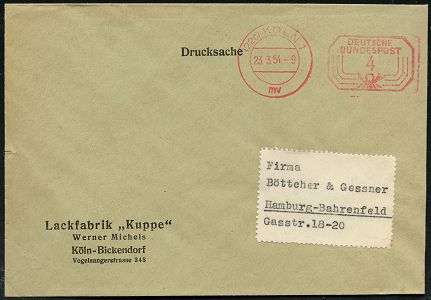 9093 | 6 € | 5000 KÖLN (Post-Freistempel) : (22c) KÖLN 1/ mv/ DEUTSCHE/ BUNDESPOST 1954 (23.3.) PFS "Querrechteck" mit Posthorn u Postleitzahl, UB "mv" , 4 Pf. , Firmen-Bf.: Lackfabrik "Kuppe", Werner Michels.. n. Hambg. (Dü.D-16, Nr.272 = 4 Blitze) | ![]() | |