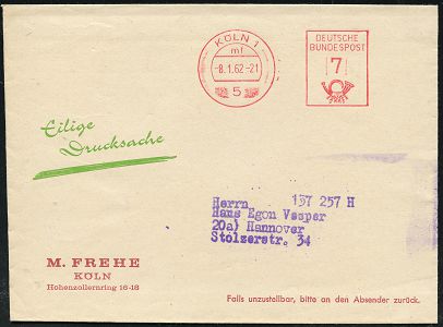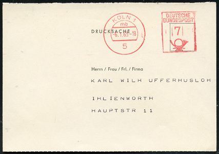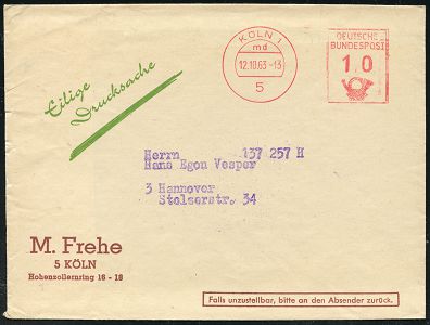 9099 | 6 € | 5000 KÖLN (Post-Freistempel) : 5 KÖLN 1/ md/ DEUTSCHE/ BUNDESPOST 1963 (12.10.) PFS "Hochrechteck" Posthorn mit neuer PLZ u. Uhrzeit, UB "md" , Firmen-Bf.: M. Frehe.. (Dü.D-17) | ![]() | |