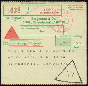 9100 | 16 € | 5000 KÖLN (Post-Freistempel) : KÖLN 12/ p/ Gebühr/ bezahlt 1965 (15.1.) roter Segment-Hand-PFS für Pakete ohne PLZ mit Uhrzeit. UB "p" , grüne NN-Selbstbucher-Paketkarte: Fa. Bergmann & Co.., schw. NN-Dreieck n. Aschen (Dürst unbekannt) | ![]() | |
