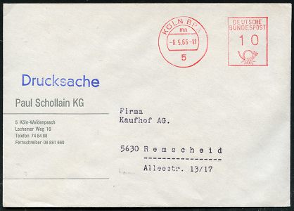 9101 | 5 € | 5000 KÖLN (Post-Freistempel) : 5 KÖLN BPA/ ma/ DEUTSCHE/ BUNDESPOST 1965 (6.5.) PFS "Hochrechteck" Posthorn mit PLZ u. Uhrzeit, UB "ma", 10 Pf. , Firmen-Bf.: Paul Schollain KG, 5 Köln-Weidenpesch.. (Dü.D-17) | ![]() | |