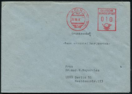 9103 | 6 € | 5000 KÖLN (Post-Freistempel) : 5 KÖLN 1/ my/ DEUTSCHE/ BUNDESPOST 1968 (23.10.) PFS "Hochrechteck" Posthorn mit PLZ o h n e Uhrzeit, dreistellig 010 (Pf.), UB "my" , Inl.-Drs.-Bf. n. West-Berlin (Dü.D-17) | ![]() | |