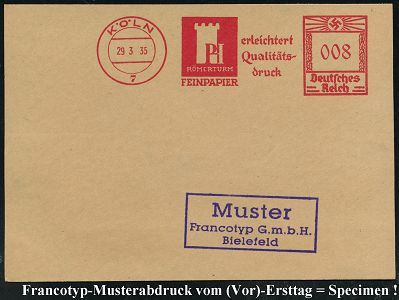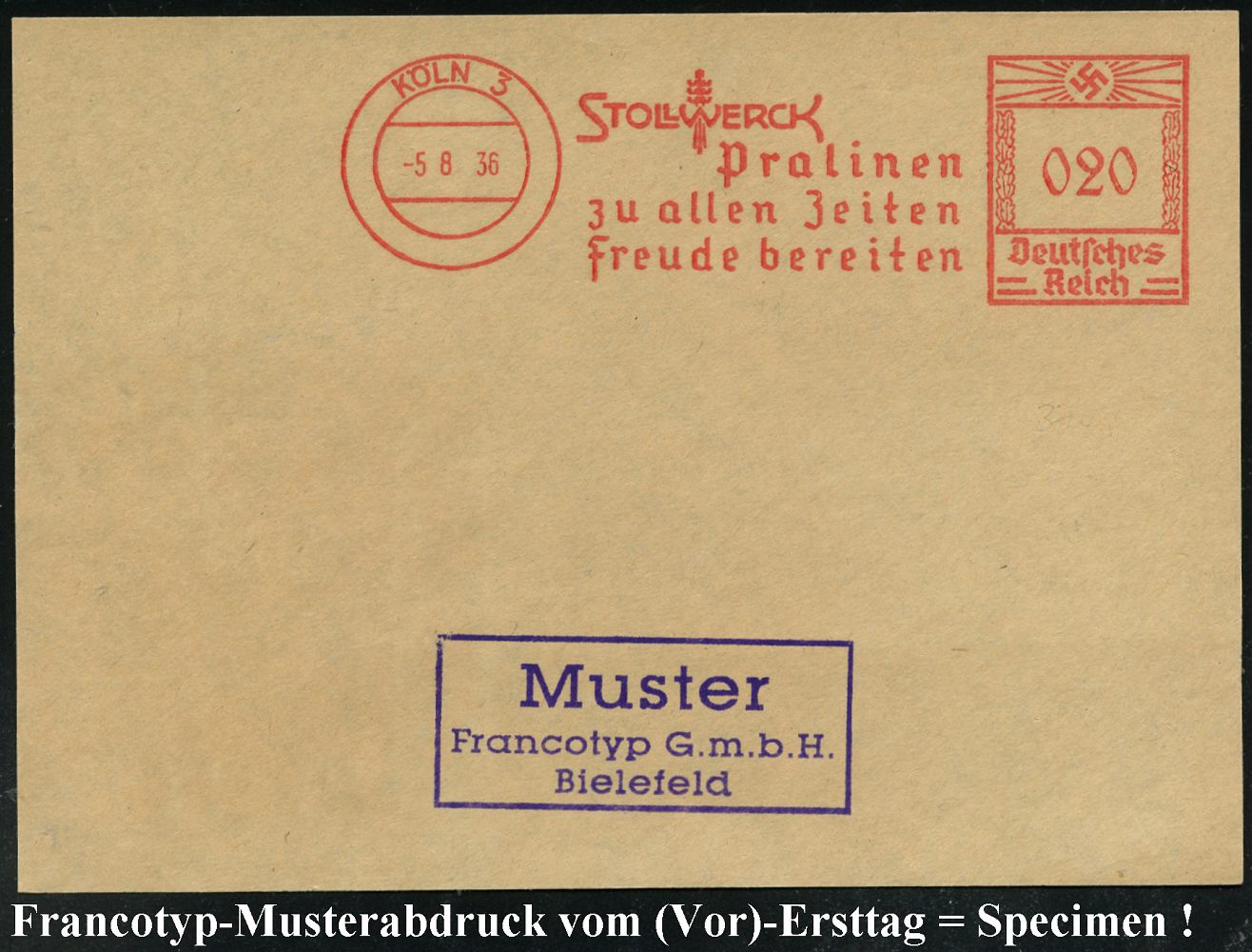 9192 | 35 € | 5000 KÖLN (Absender-Freistempel) : KÖLN 3/ STOLLWERCK/ Pralinen/ zu allen Zeiten.. 1936 (5.8.) AFS Francotyp-Musterabdruck "Hakenkreuz" (Firmen-Logo: Komet) glasklar gest. Francotyp-Musterblatt vom (Vor)-Ersttag !, selten! (Dü.E-3CEo) | ![]() ![]() | |