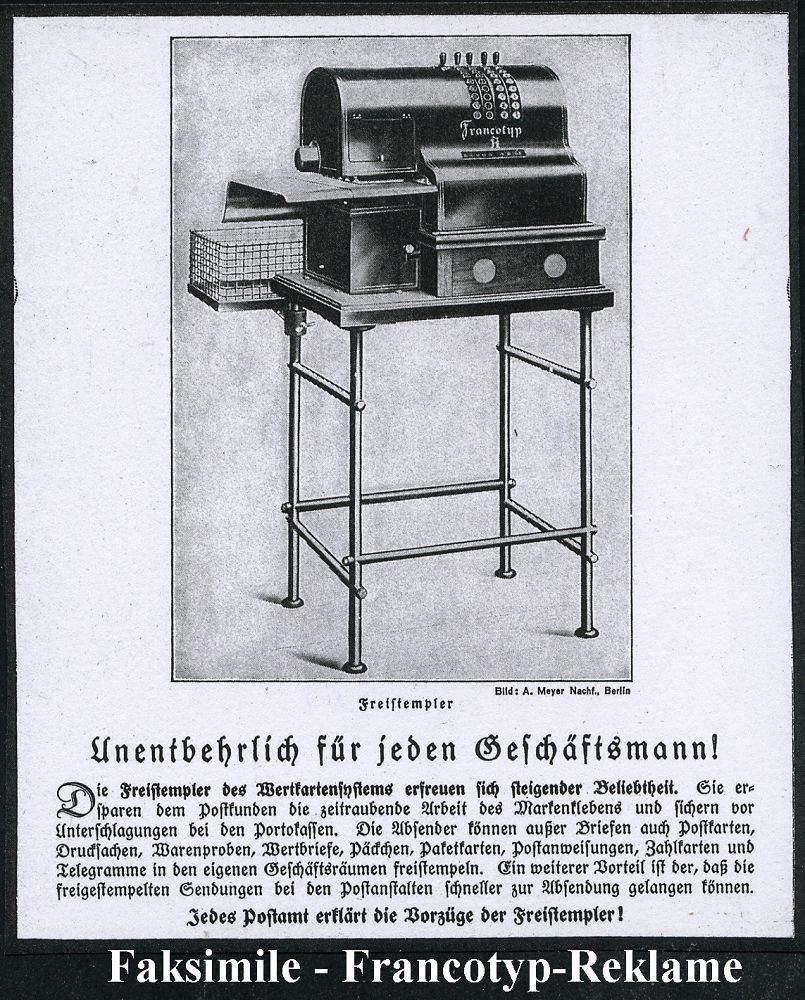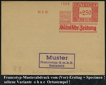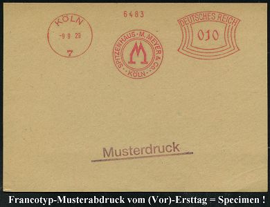 9113 | 35 € | 5000 KÖLN (Absender-Freistempel) : KÖLN/ 7/ SPITZENHAUS M.MEYER & Co 1929 (9.9.) AFS-Musterabdruck Francotyp "Bogenrechteck" (Firmen-Logo: stilis. Kölner Dom) glasklar gest. Francotyp-Musterblatt vom (Vor)-Ersttag !, selten! (Dü.E-1CEh, = frühe C-Maschine!) | ![]() ![]() | |