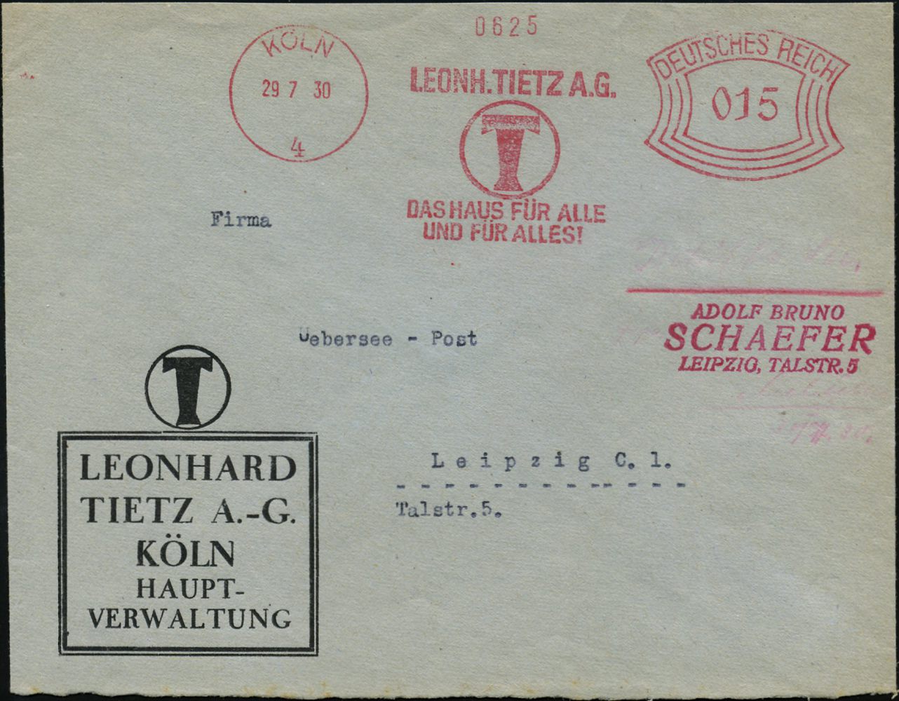 9118 | 25 € | 5000 KÖLN (Absender-Freistempel) : KÖLN/ 4/ LEONH.TIETZ AG./ DAS HAUS FÜR ALLE/ U.FÜR ALLES! 1930 (29.7.) AFS Francotyp "Bogenrechteck" (Monogr.-Logo "T") motivgl. Firmen-Bf.: HAUPTVERWALTUNG (Firma nach 1933 von den Nazis "arisiert" zu "HerTie" !) (Dü.E-1CEh) | ![]() | |