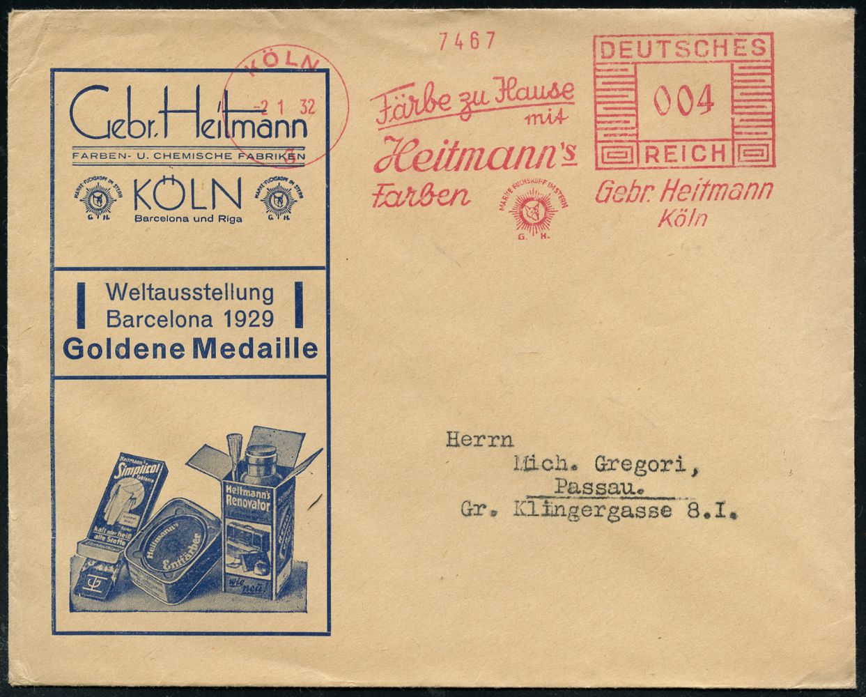 9130 | 30 € | 5000 KÖLN (Absender-Freistempel) : KÖLN/ 3/ Färbe zu Hause/ mit/ Heitmann´s/ Farben/ Gebr. Heitmann.. 1932 (2.1.) AFS Francotyp "Mäanderrechteck" (Firmenlogo: Fuchskopf) auf motivgl. Reklame-Bf.: Färber- u. Entfärber-Packungen "Weltausstellung Barcelona 1929 Goldene Medaille" (Packungen, 2x Logo mit Fuchskopf), dekorativer Beleg! (Dü.E-2CEh) | ![]() | |