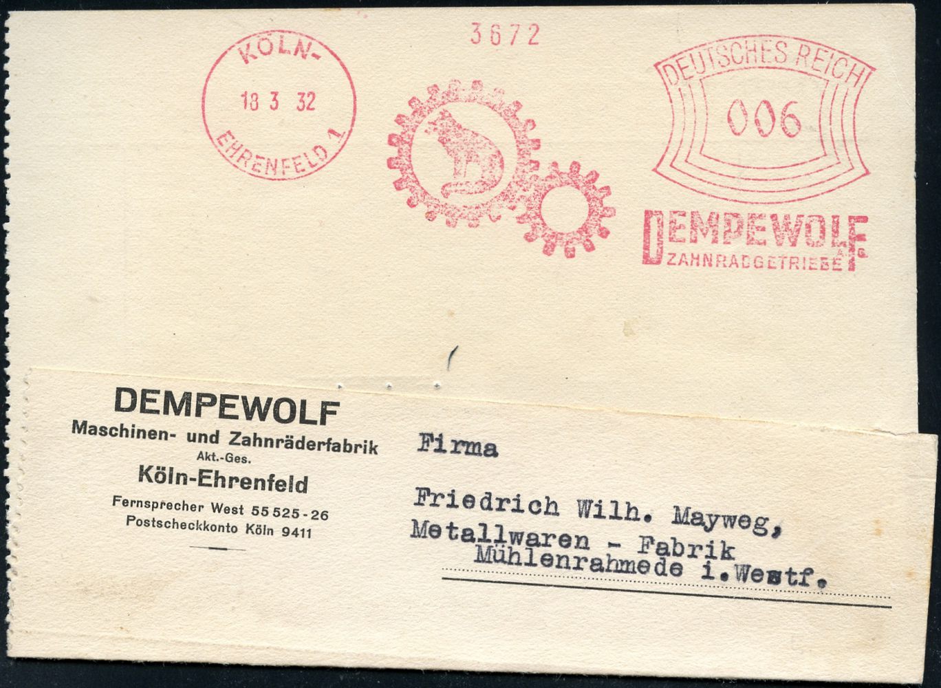 9132 | 25 € | 5000 KÖLN (Absender-Freistempel) : KÖLN-/ EHRENFELD 1/ DEMPEWOLF/ ZAHNRADGETRIEBE 1932 (18.3.) AFS Francotyp "Bogenrechteck" = Wolf (im Zahnrad) Firmen-Kt. (Dü.E-1CEh) | ![]() | |