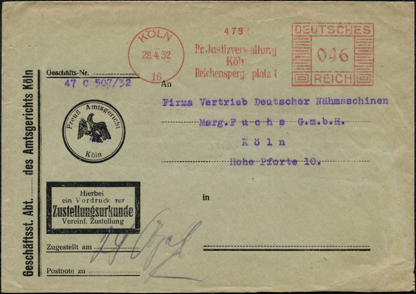 9134 | 25 € | 5000 KÖLN (Absender-Freistempel) : KÖLN/ 6/ Pr.Justizverwaltung/ Köln/ Reichenspergerplatz 1 1932 (28.4.) AFS Francotyp "Mäanderrechteck" 046 Pf. auf Dienst-Bf.: Preuß. Amtsgericht.. Zustellungsurkunde (preuß. Adler) Orts-ZU, seltenes Porto! (Dü.E-1BAh) | ![]() | |