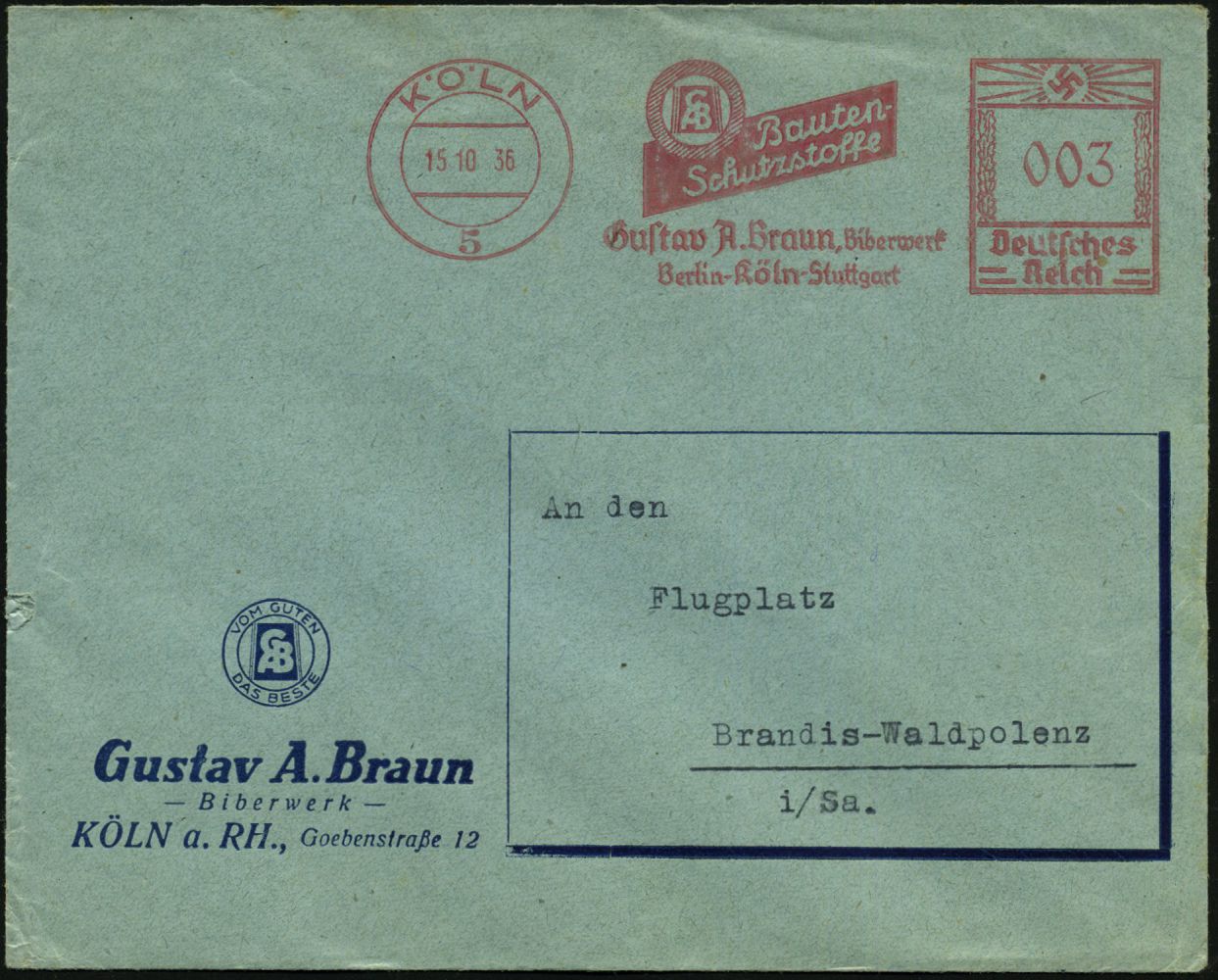 9177 | 20 € | 5000 KÖLN (Absender-Freistempel) : KÖLN/ 5/ Bauten-/ Schutzstoffe/ Gustav A.Braun,Biberwerk.. 1936 (15.10.) AFS Francotyp "Hakenkreuz" (Monogr.-Logo) klar gest., motivgl. Firmen-Bf. (Dü.E-3CEo) | ![]() | |