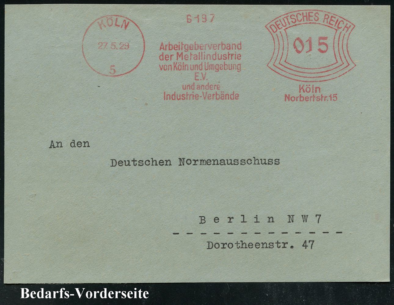 9109 | 14 € | 5000 KÖLN (Absender-Freistempel) : KÖLN/ 5/ Arbeitgeberverband/ der Metallindustrie/ von Köln u.Umgebung.. 1929 (27.6.) AFS Francotyp "Bogenrechteck" auf Bedarfs-Vorderseite (Dü.E-1BAh) | ![]() | |