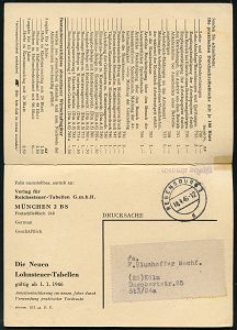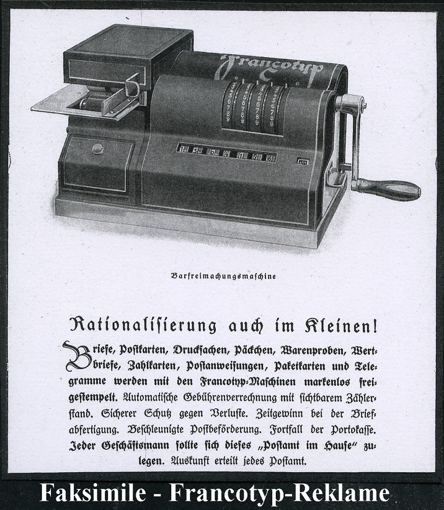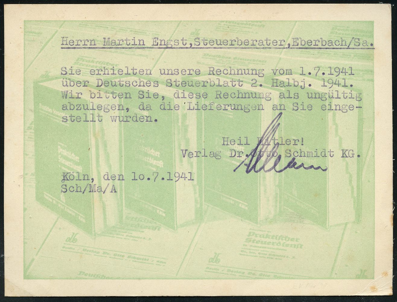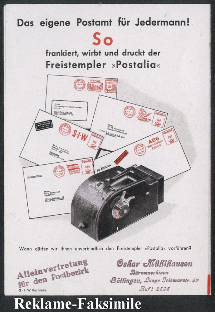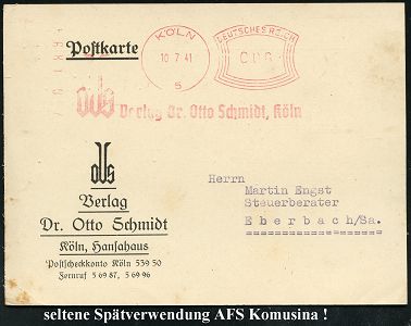 9256 | 30 € | 5000 KÖLN (Absender-Freistempel) : KÖLN/ 5/ oVs Verlag Dr.Otto Schmidt.. 1941 (10.7.) seltener AFS Komusina "Bogenrechteck" auf Reklame-Kt., rs. Bücher zum Steuerrecht (kl. Randfleckchen) die Firma Komusina ging 1930 in Konkurs, die Fa. Francotyp übernahm die Wartung der Frankiermaschinen, sehr späte Komusina-Verwendung! (Dü.E-1 Ko) | ![]() ![]() | |