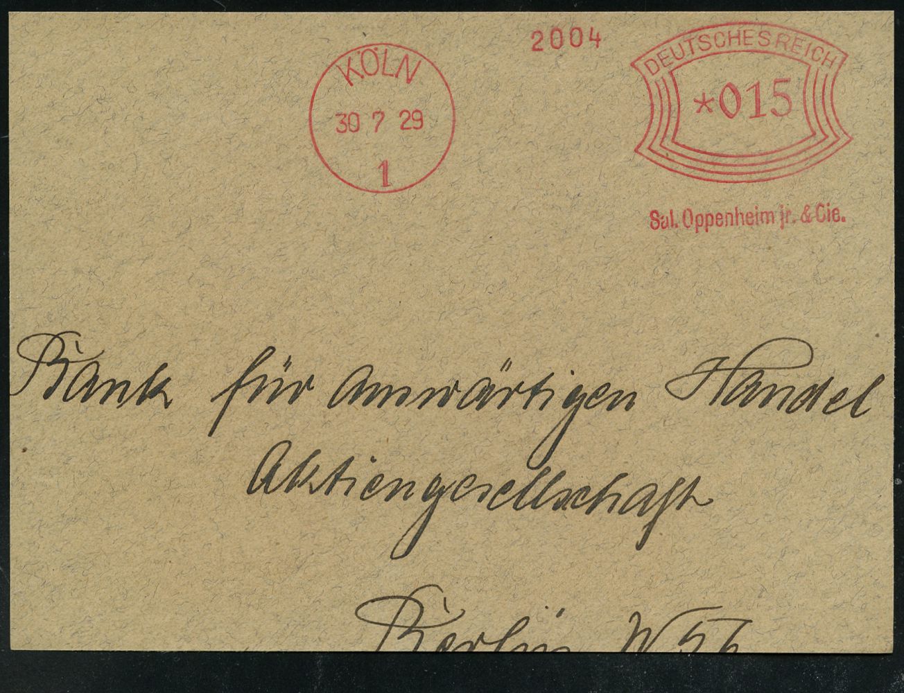 9112 | 16 € | 5000 KÖLN (Absender-Freistempel) : KÖLN/ 1/ Sal.Oppenheim jr. & Cie. 1929 (30.7.) AFS Francotyp "Bogenrechteck" auf Teil-Vorderseite, war größte Privatbank Europas, 1789 von Samuel Oppenheim gegr., 1938 zur Bank Pferdmenges "arisiert", 2009 nach "Esch"-Affäre von Deutscher Bank gerettet, 2018 aufgelöst , vergl. Kat.-Nr. 9233 ! (Dü.E-1Ah) | ![]() | |