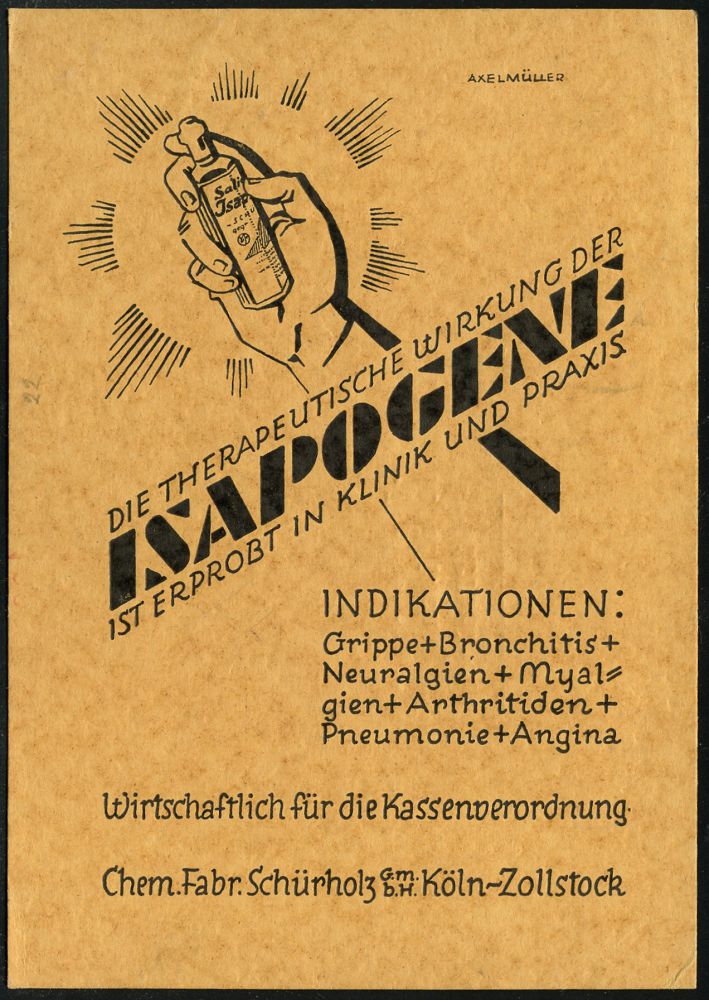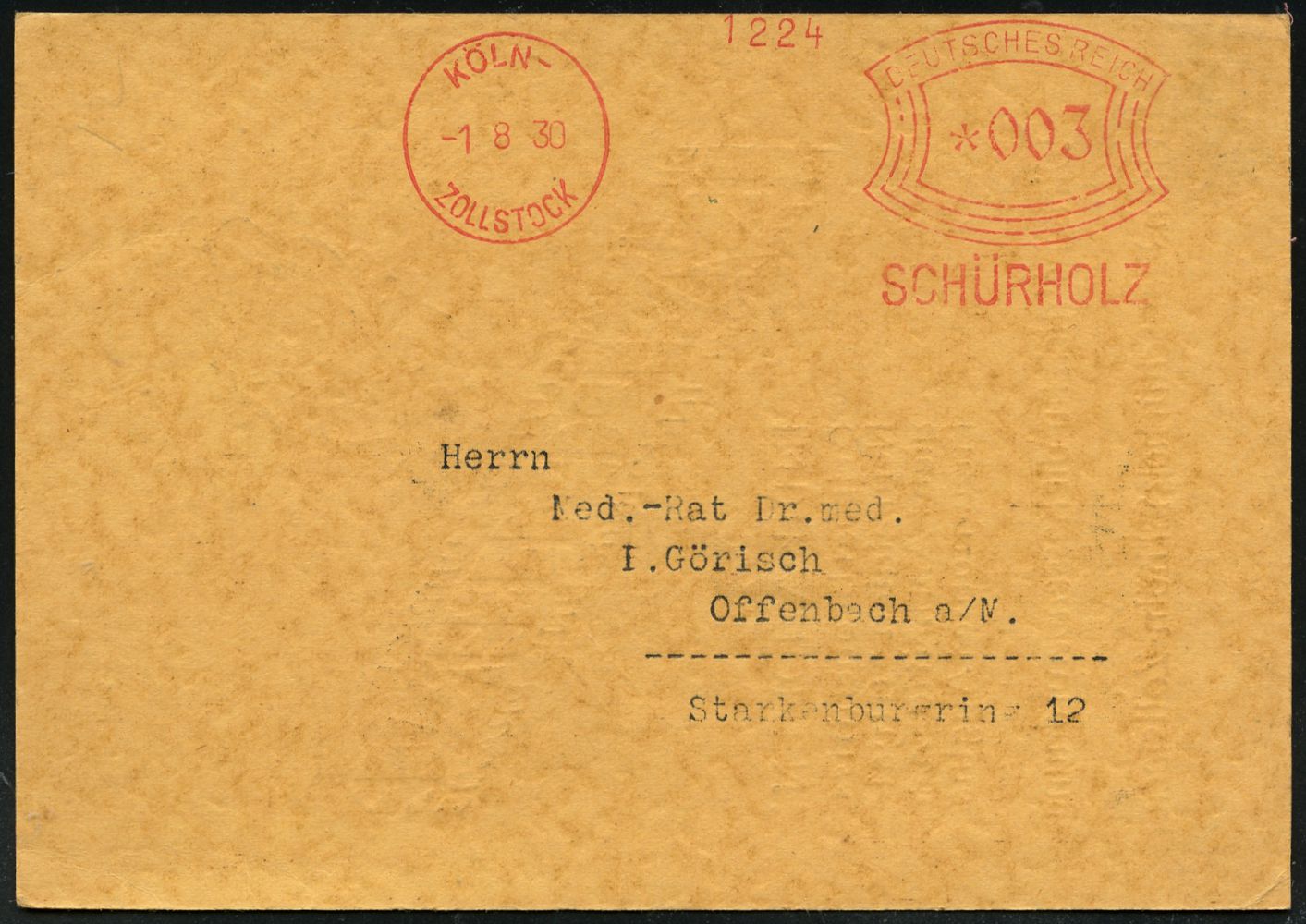 9119 | 25 € | 5000 KÖLN (Absender-Freistempel) : KÖLN-/ ZOLLSTOCK/ SCHÜRHOLZ 1930 (1.8.) AFS Francotyp "Bogenrechteck" auf s/w.-Reklame-Kt.: Chem. Fabrik Schürholz ISAPOGENE.. (Hand mit Spray gegen Grippe etc.) n. Offenbach (Dü.E-1Ah) | ![]() ![]() | |